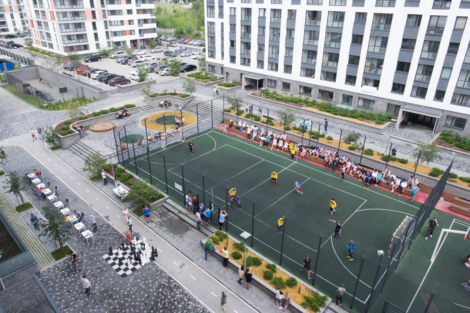 Aire de jeux caoutchoutée avec des équipements de fabricants suédois. Unique en son genre et considéré comme unique dans la ville. Les places de parking du complexe sont souterraines, la présence d'enfants sur le site est donc totalement sécurisée.