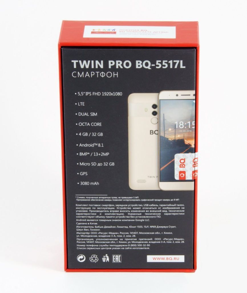 Le smartphone BQ-5517L Twin Pro est livré dans un emballage en carton dense de couleur rouge vif, au dos duquel se trouvent des informations sur les principales caractéristiques techniques de l'appareil.