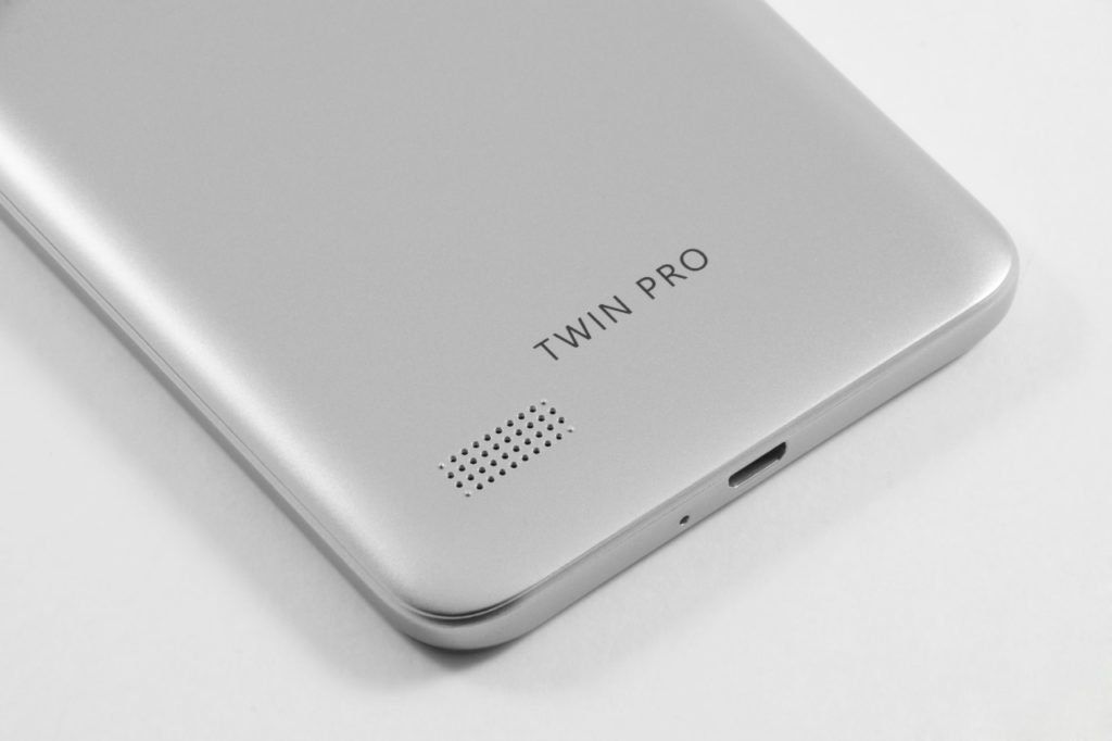 Les prises casque (prise audio 3,5 mm) et chargeur sont implantées sur les faces supérieure et inférieure du smartphone de manière standard. Également au bas de l'appareil se trouvent un port microUSB (il existe un support pour connecter un câble OTG, avec lequel il est possible de fabriquer une batterie externe de Twin Pro pour un autre smartphone) et le microphone principal.