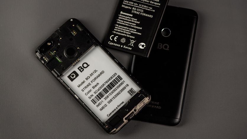 Comme tout téléphone portable, le BQ-5512L Strike Forward a un corps pliable qui vous permet de retirer le couvercle de son panneau arrière. En dessous se trouvent une batterie de chargement, des emplacements pour deux cartes SIM et une carte mémoire microCD.