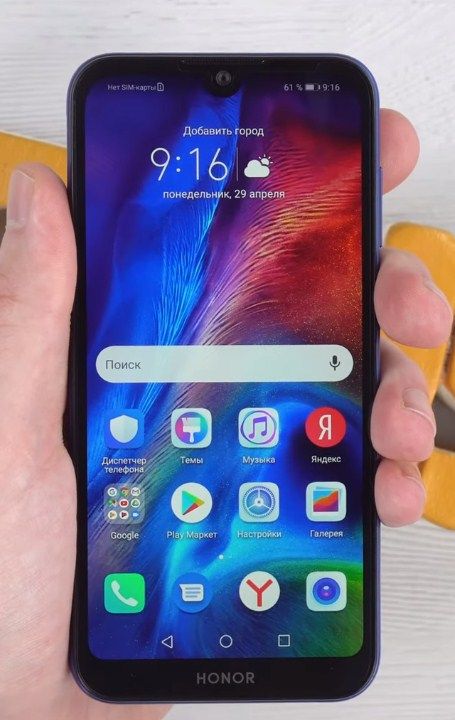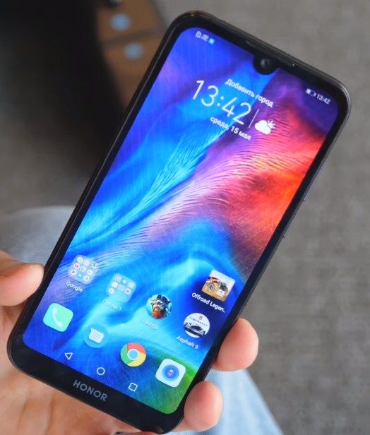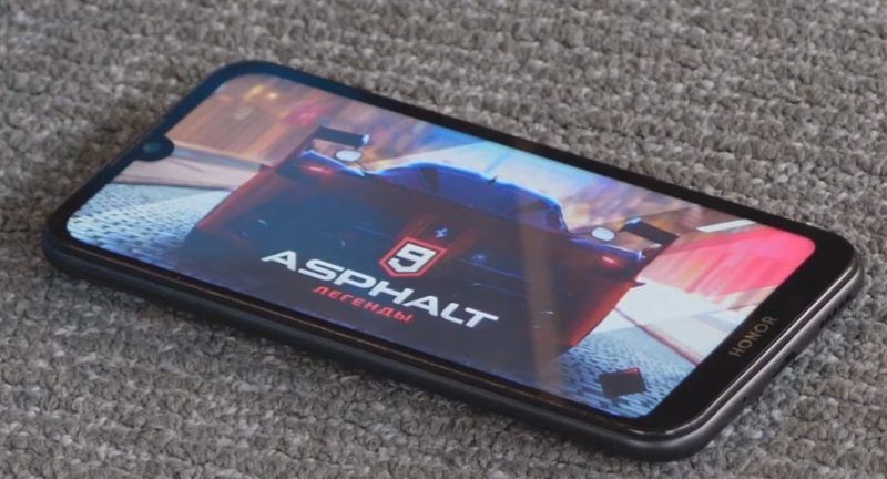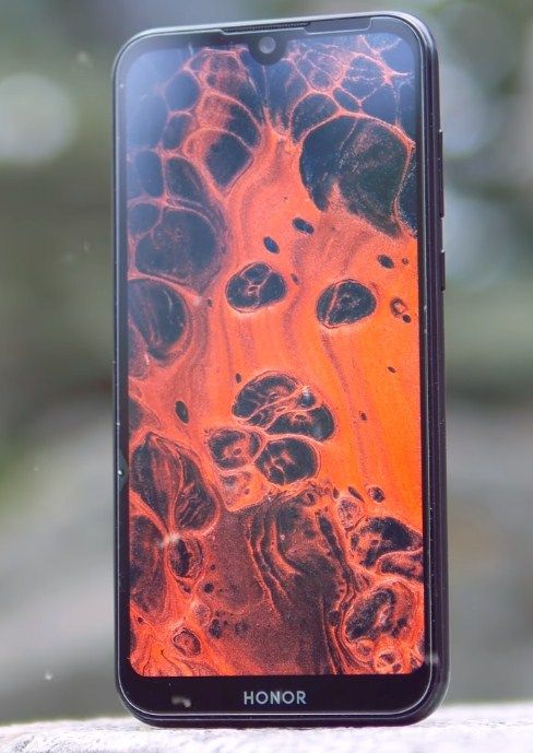 Sur la surface avant au milieu se trouve une découpe en forme de goutte où la caméra frontale est installée. Au-dessus de la caméra, il y a une grille pour un microphone parlant, un capteur de lumière et de proximité, en bas il y a un petit menton avec le logo Honor et des boutons de navigation virtuels.La prise casque est en haut, le microphone, le port microUSB et le haut-parleur sont en bas. La bascule du volume et le bouton d'alimentation sont situés sur le côté droit, sur la gauche se trouve un emplacement pour une carte mémoire et des cartes SIM.
