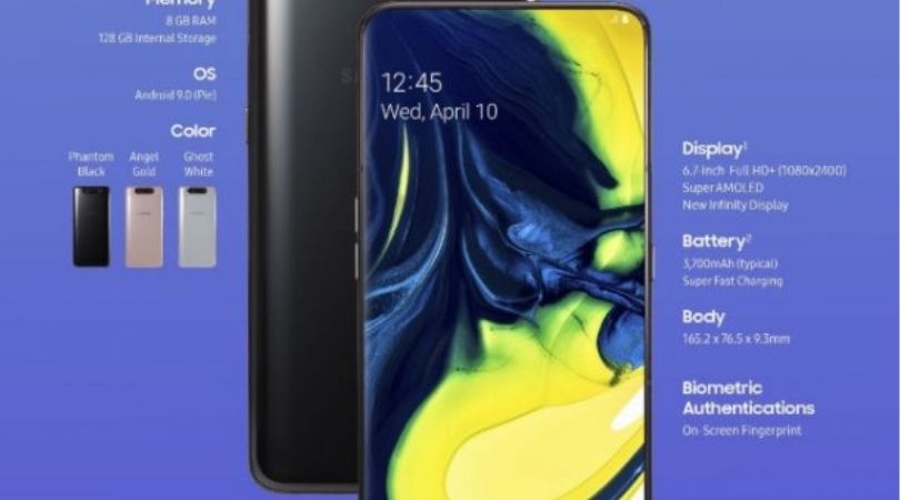 L'écran Galaxy A80 de Samsung est basé sur une matrice Super AMOLED et la résolution est de 2400x1080 px. Les rapports d'aspect sont inhabituels, mais avec un rapport d'aspect "ciné" de 20:9.