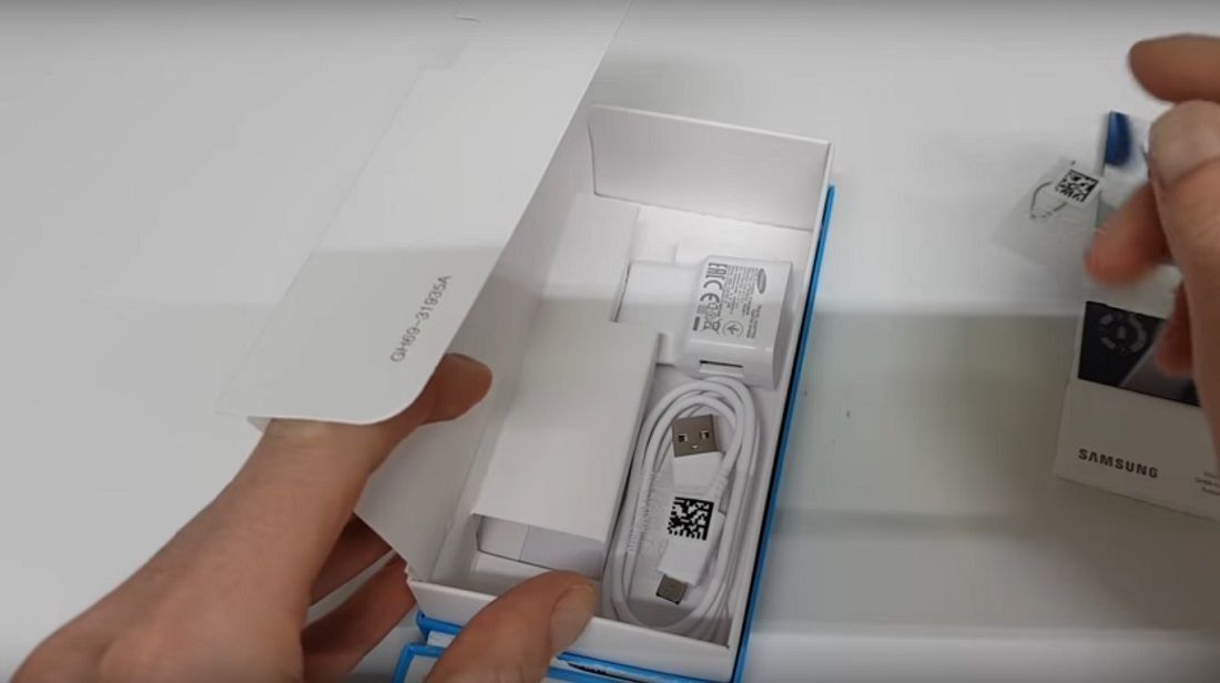 Le téléphone est livré avec un chargeur. BE—PG950 Avec câble USB taper C et adaptateur sur le Micro USB. La longueur du cordon de l'adaptateur est de 1 mètre. Étonnamment, il n'y a pas d'écouteurs inclus. Bien que le casque, même le moins prétentieux, ne soit même pas inclus dans les modèles de smartphones les plus populaires et les moins chers de divers fabricants. Samsung pour une raison avare.