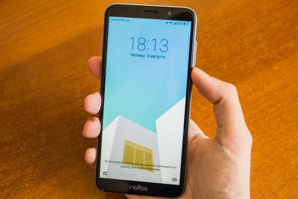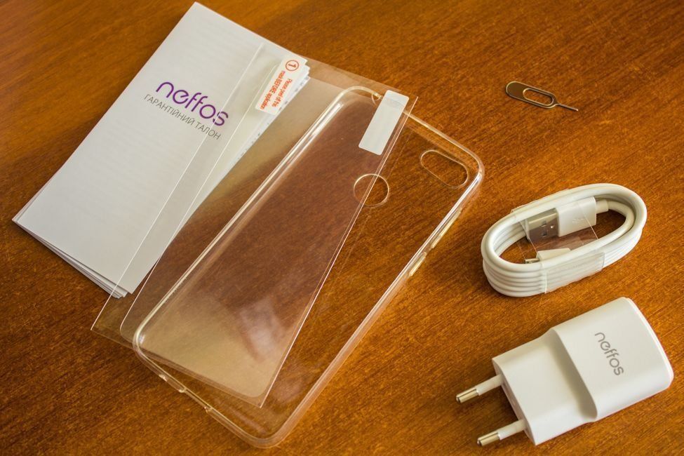 Ce modèle a une disposition typique des éléments. Ceux-ci incluent : un judas de caméra frontale, un haut-parleur qui exécute toutes les fonctions (conversations et lecture audio), des capteurs de lumière et de proximité. Un flash est installé en haut de l'écran. Le logo Neffos est dessiné sous l'écran de l'appareil.