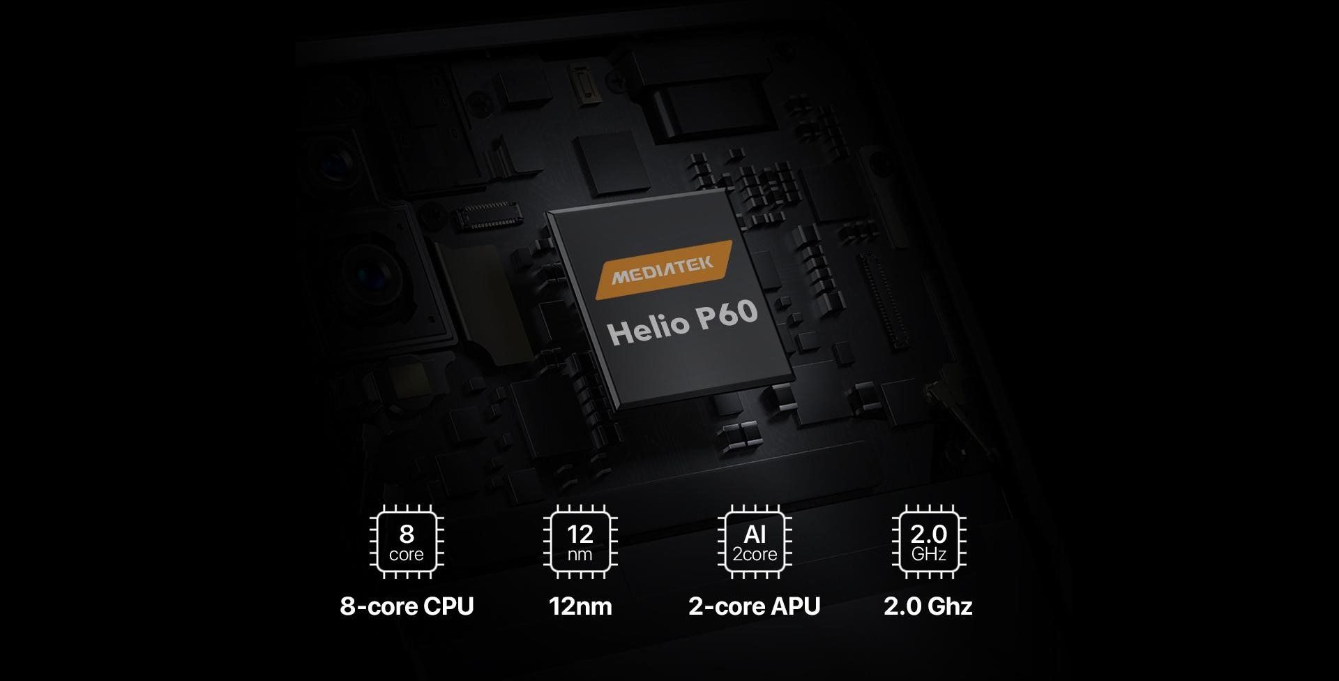 | Le fer | MediaTek Helio P60 2 GHz, 4 x Cortex-A73, 4 x Cortex-A53, Mali-G72 MP3 |