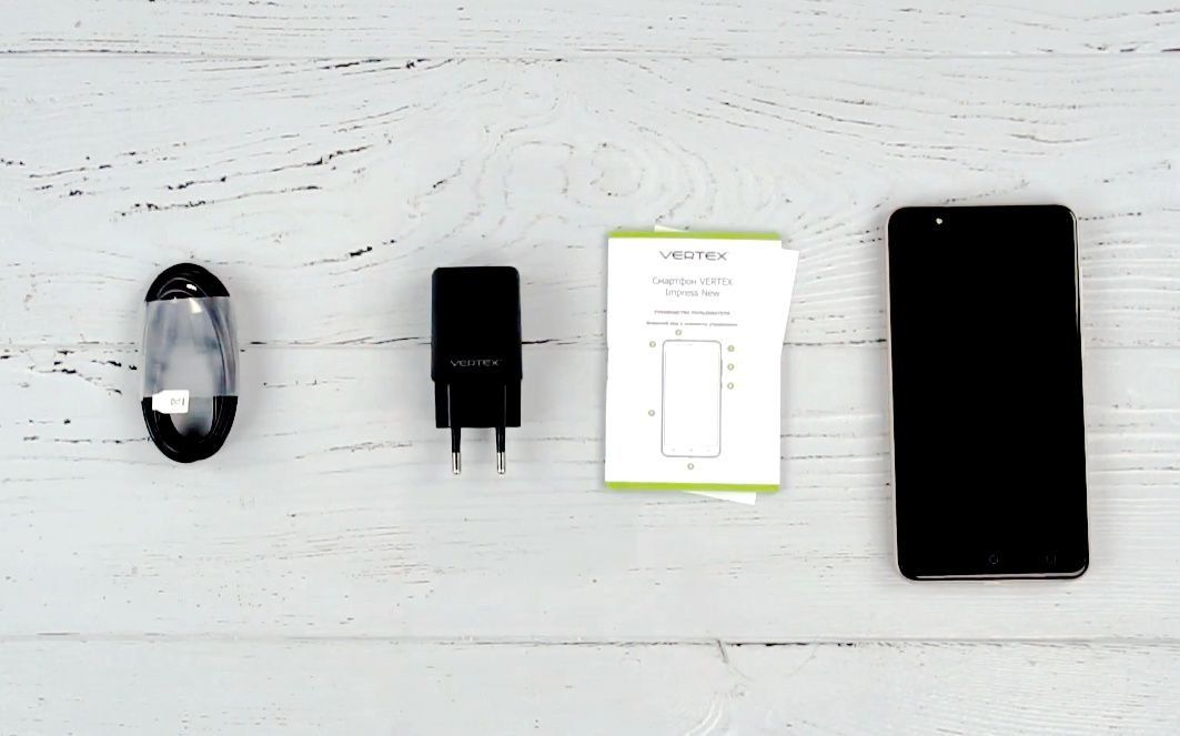 Smartphone Vertex emprisonné dans une élégante boîte noire. Des documents pour le téléphone, l'appareil lui-même, un câble micro-USB, une batterie, un chargeur attendent à l'intérieur de l'utilisateur. La garantie est fixée par le fabricant pour une durée de 2 ans.