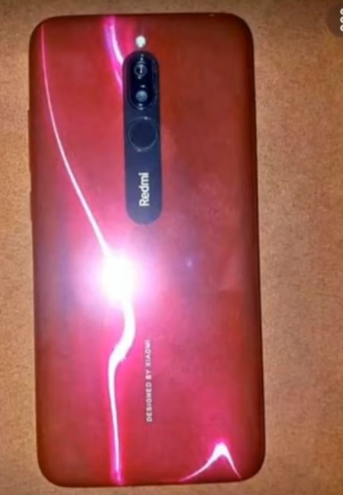 Le panneau arrière est en plastique brillant avec un choix de nuances dégradées de noir, rouge ou bleu. Sur le panneau, au milieu de la surface, il y a un double module de caméra principal, au-dessus se trouve un flash LED, en dessous se trouve un capteur d'empreintes digitales et en dessous se trouve l'inscription Redmi. Encore plus bas se trouve l'inscription Designed by xiaomi.