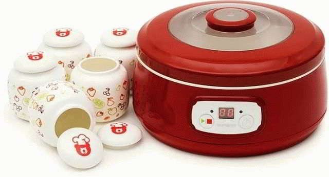 Une machine assez compacte et légère pour faire du yaourt, du fromage cottage et d'autres produits laitiers. La petite taille lui permettra de trouver une place confortable, même dans une cuisine remplie. Le nombre de gobelets pouvant tenir dans le récipient principal est de 8 pièces. Une telle yaourtière fonctionne, ne consommant que 50 watts d'électricité. Le coût de cet appareil est de 2600 roubles.