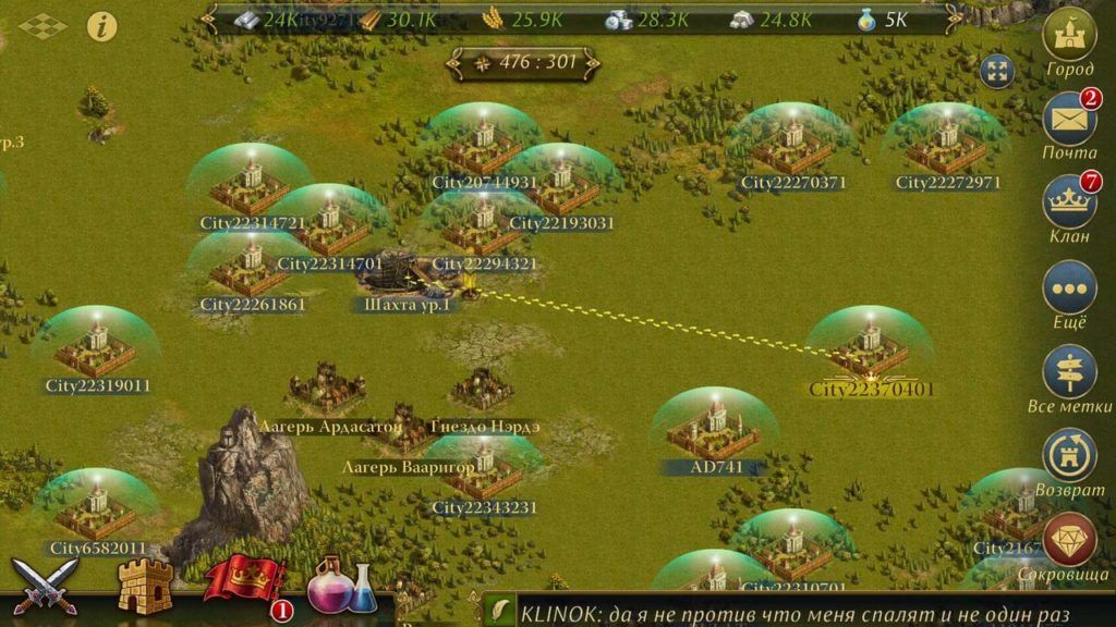 La carte et l'interface conviviale indiqueront à l'utilisateur les terres et les établissements voisins qui y vivent. De là, il sera possible de connaître les intentions des voisins - la convivialité ou l'inimitié les motive. La sécurité de la ville sera assurée par des murs fiables qui peuvent être construits pour une certaine quantité de ressources. Pour augmenter la fiabilité, vous pouvez mettre des sentinelles.