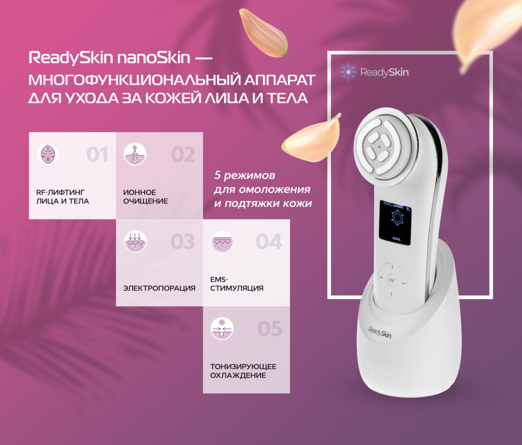 L'appareil multifonctionnel de la marque ReadySkin est conçu à l'aide des dernières technologies en Corée du Sud, qui fournit un niveau professionnel de soins de la peau. L'appareil convient aux soins de la peau non seulement pour le visage, mais également pour le corps, et comprend 5 modes de fonctionnement pour le rajeunissement et le resserrement :