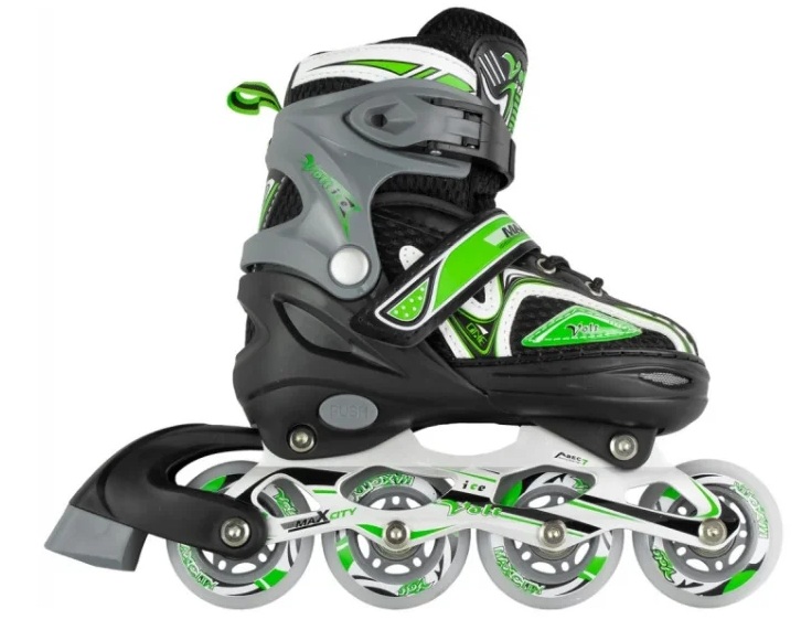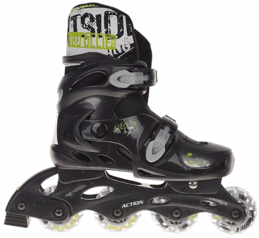 Rouleaux avec mécanisme coulissant, tirage rapide, sangle de talon et boucle supérieure, équipés de bottes souples, de roues en polyuréthane et d'un frein arrière. Les 4 roues ont le même diamètre - 7,6 cm Roulements - ABEC 5.