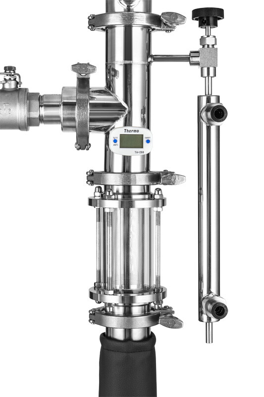En plus du cube de distillation et du cuiseur à vapeur, le kit comprend un raccord de serrage avec un joint et deux thermomètres numériques. S'il est nécessaire de compléter la conception avec un dioptre de visualisation ou un côté de tiroir, cet équipement est acheté séparément.
