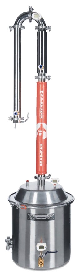 Le modèle est équipé d'un cuiseur à vapeur sec 15 cm, d'un condenseur à reflux, d'un réfrigérateur. La connexion à pince universelle permet de mettre à niveau l'appareil pour élargir la gamme de boissons produites. Mais même l'équipement de base permet de faire du moonshine, du whisky, de la vodka, du chacha, du calvados, du cognac. Une redistillation est nécessaire pour obtenir la rectification.