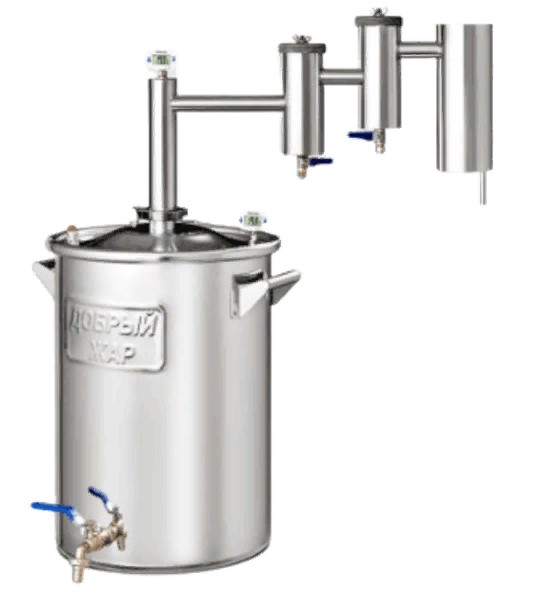 Ce modèle se compose de 2 réservoirs et d'un circuit de refroidissement à la vapeur. Braga est versé dans le premier récipient et il est chauffé, et après refroidissement par le premier circuit, le produit entre dans le deuxième réservoir, où, chauffé à l'aide du premier, il acquiert de la vapeur d'alcool. Ces derniers entrent dans le deuxième circuit de refroidissement, la vapeur se condense et le résultat est une boisson alcoolisée purifiée forte et de haute qualité de double distillation.