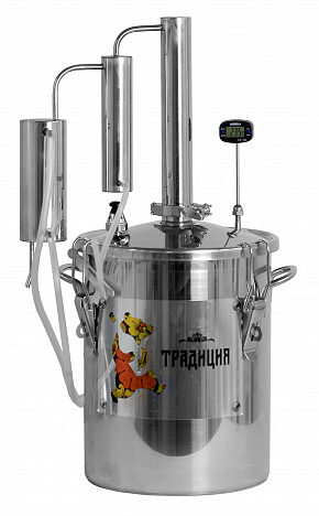 Les alambics Moonshine sous la marque Tradition sont produits par Chelyabinsk UZBI. Le modèle est disponible en plusieurs tailles.Le réservoir de 14 litres a une hauteur de 30 cm et un diamètre de 24 cm.Le matériau de construction principal est l'acier inoxydable de qualité alimentaire. Le fond du cube de distillation a une épaisseur de 2 cm, est capsulaire. Cela vous permet de chauffer la cuve sur tout type de cuisinière, y compris l'induction. Il n'y a pas d'élément chauffant intégré.