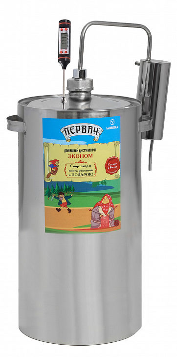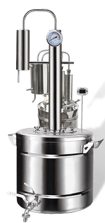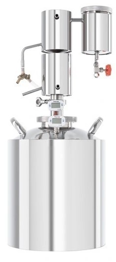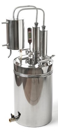 Cette conception vous permet d'obtenir un produit de double distillation de qualité en peu de temps. La conception du distillateur comprend un réservoir principal d'un volume de 20 litres, un verre intérieur, un refroidisseur à double circuit, un vaporisateur sec pliable. Ce dernier est utilisé pour une purification et une aromatisation supplémentaires de l'alcool brut. Le fabricant a prévu la présence d'une grue pour la sélection des têtes et des queues, ce qui facilitera la sélection du nombre de têtes requis dès le premier transport, en coupant les queues. Un confort supplémentaire et des possibilités d'utilisation plus larges sont apportés par la présence de deux thermomètres électroniques, un fond plat, un cuiseur vapeur équipé d'un robinet de vidange.