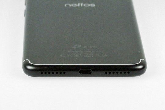 En bas de l'écran se trouve le logo Neffos, en haut se trouvent la caméra, l'indicateur LED et les capteurs. Au bas du smartphone se trouvent des trous ronds, sous lesquels se trouvent le haut-parleur et le microphone.