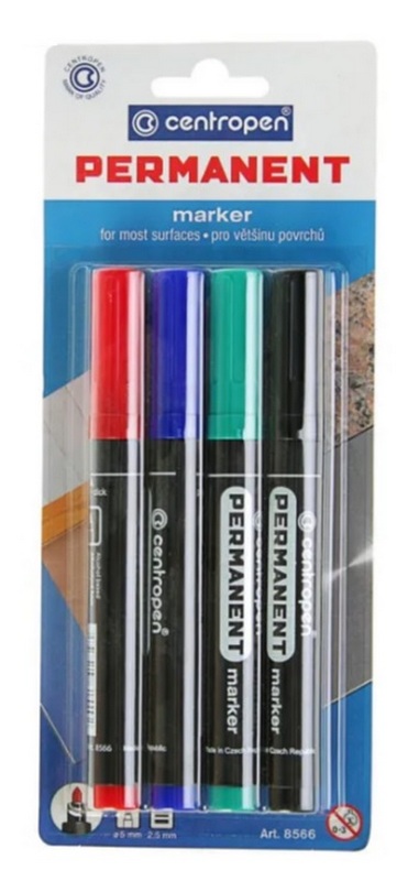 Dünyaca ünlü CENTROPEN markasına ait bu kalıcı alet seti, kumaşlar, camlar, filmler, plastikler gibi hemen hemen her yüzeye yazmanıza olanak tanır. Altyazılar, başlıklar, reklam türü oluşturmak için kullanılabilir. Çizgilerin rengi ve doygunluğu zamanla solmaz ve güneş altında solmaz. Marker mürekkebi aşınmaya, su ile etkileşime ve çökelmeye karşı dayanıklıdır. Mürekkebin bileşimi, cam tekniğinde çalışmanıza izin veren alkoldür. Yuvarlak uç, 2,5 milimetre kalınlığa kadar çizgi çizmeye izin verir. Sette dört renk var: kırmızı, mavi, yeşil, siyah. Perakende zincirleri için önerilen maliyet 350 ruble.