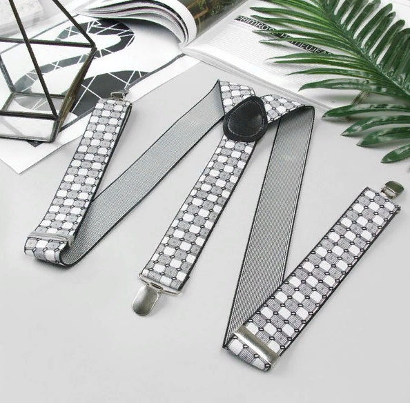 Yenilik klasik bir tarzda yapılmıştır. Gri ve beyaz bir dama tahtası deseni, düz renkli bir takım elbise ile iyi gider. Bant genişliği - 3,5 cm, uzunluk - 95 cm Y şeklindeki stil, evrensel metal klipslerle tamamlanmaktadır. Her türlü pantolonu güvenli bir şekilde tutarlar ve giymeleri rahattır. Geniş metal klipsler, askıların uzunluğunu ayarlamaya yardımcı olur. Arkada, şeritler siyah suni deriden bir orta parça ile birleştirilmiştir. Çevrimiçi sipariş verilebilen ürünün maliyeti 393 ruble.