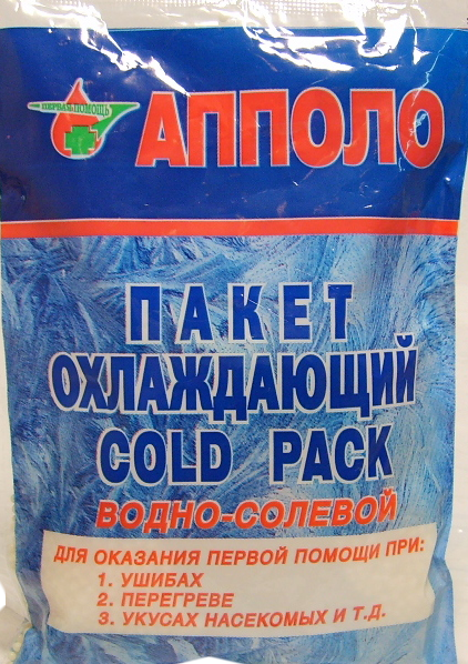 Bu alet, herhangi bir çürük ve yaralanmanın lokal olarak soğutulması için kullanılır.Paketin yüzeyindeki minimum sıcaklık 0 ila +3 derece arasındadır. Rus üretimi, marka: Snezhok. Paket iki bölümden oluşur: bir dış paket ve bir iç. İç kısım su ile, dış kısım ise amonyum nitrat ile doldurulur. Maliyet: 28 ruble.