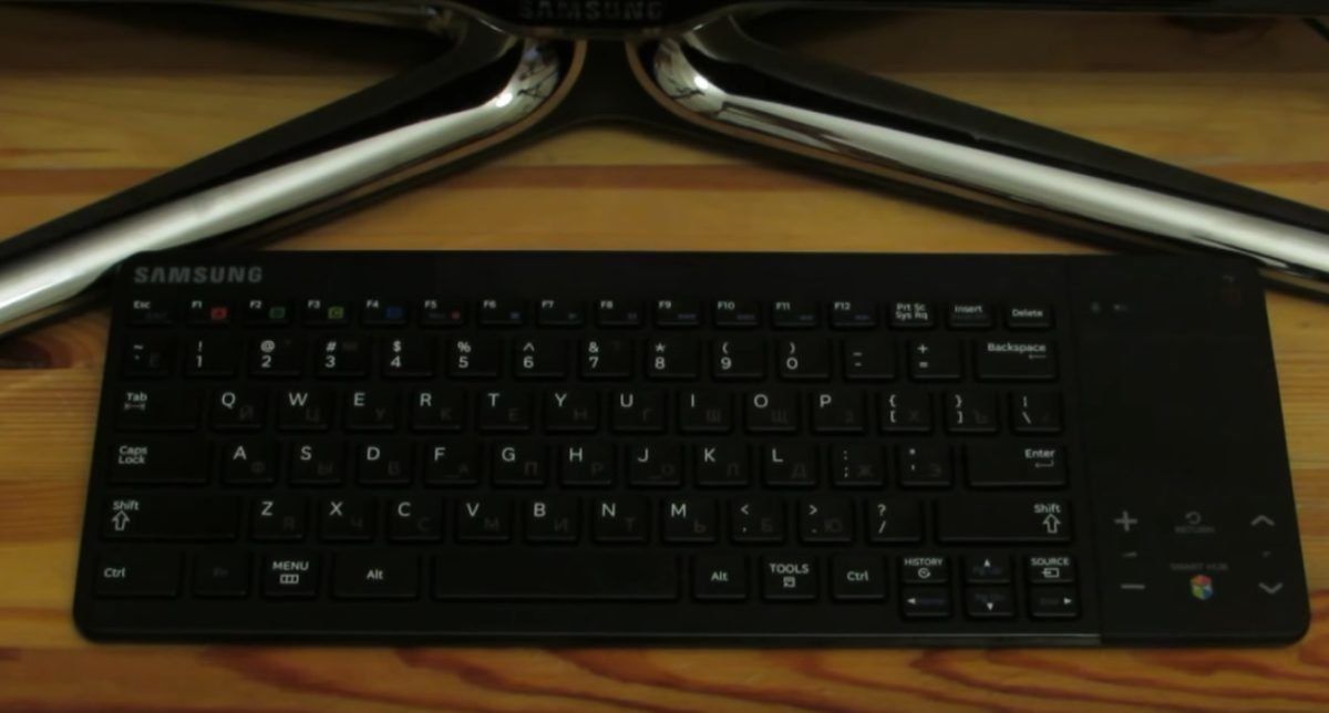 Şirketin logosu da ileride göze çarpıyor - sol ve üst köşede, lastik tuşlar. Düzen multimedya ve standarttır - QWERTY. Sağ köşede üç LED göstergesi vardır: Bluetooth, pil ve TV açık/kapalı.