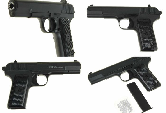 Hong Kong'da (Galaxy) yapılmıştır. TT savaş modelinin bir kopyası. Görünüm ve kalibre (6 mm) orijinalinden tamamen korunmuştur. Çalışma prensibi, tek bir ateşleme moduna sahip yaylı bir tabancadır. Kesinlikle herkes için değil, çünkü tetiğin manuel olarak açılması otomasyon hayranlarını zorlayacaktır. 11 mermi için şarjör, 70 m'ye kadar ateş hızı.