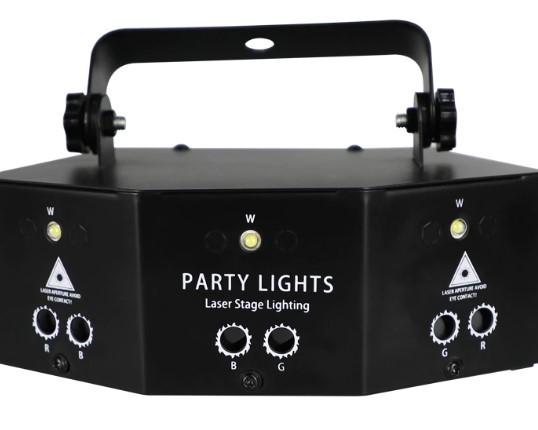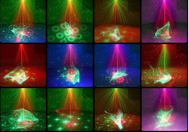 Lazer, ana renklerle karakterize edilir - kombinasyonu başka birçok gölge veren RGB olarak kısaltılan kırmızı, yeşil ve mavi. Bazı durumlarda, cihaz RGBW olarak adlandırılacak ek bir mor lazer ile donatılmıştır. Güç tüketimi, LED'den daha yüksektir, bu da geniş çalışma alanlarında kullanılmasına izin verir. Lazer projeksiyon efektleri nokta, ışın, animasyon olabilir.