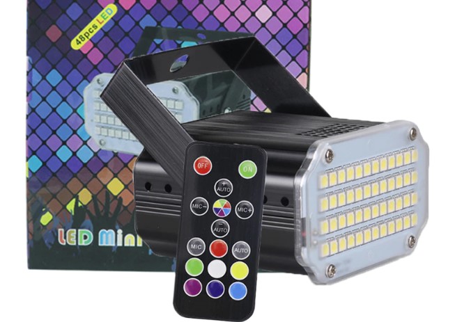 48 parlak LED, ultraviyole ve beyaz parıltı olasılığı herhangi bir partiyi unutulmaz kılacaktır. Stroboskopun hızı kontrol edilebilir, bunun için cihazda mavi işaretli özel bir düğme bulunur. İkinci düğme, çalışma modunu seçmenize, ses kontrolünü ayarlamanıza veya otomatik çalıştırmayı etkinleştirmenize izin verecektir. Cihaz, herhangi bir yüzeye monte edilebilir veya tutamağa asılabilir. Ancak cihazın bir ağdan güç aldığını ve kablo uzunluğunun sadece 1 metre olduğunu hatırlamakta fayda var.