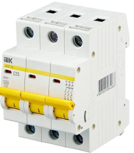 Bu üç kutuplu devre kesici, devreyi aşırı yüklerden korumak için tasarlanmıştır. "IEK BA47-29 3P(C) 4,5 kA" normal olarak 48 V anma akımında çalışır. Evsel ve endüstriyel kullanıma uygundur. Rahat kullanım için, kontakların çalışma durumunu gösteren renkli göstergeler sağlanmıştır. Cihaz üçüncü sınıf akım sınırlamasına sahiptir ve kısa devre akımına dayanıklıdır. Montaj, bir DIN rayına vidalı bağlantı ile yapılır, alet gerekmez.