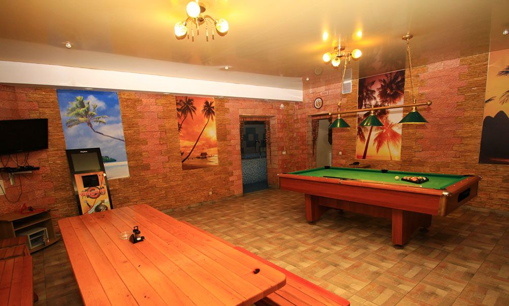 Sauna odası geniştir, büyük bir şirkette dinlenmek için uygundur, giyinme odası, TV'li oturma odası, klima ve 6-8 kişilik bir masa (birinci katta), iki yatak odası ve bir oturma odası içerir. (ikinci katta)