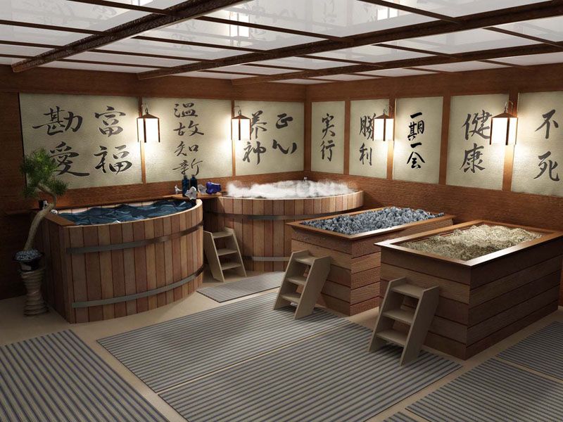 İki türe ayrılan en sıra dışı banyo türü: halka açık (sento) ve bireysel (furo). Furo, genellikle 50 dereceye kadar, istenen sıcaklığa ısıtılan su ile bir kişi için küçük bir havuzdur (veya varil). Aynı zamanda tankın bulunduğu odadaki hava 30 dereceye kadar ısıtılır. Namlu içinde su seviyesinin göğse ulaşmaması için özel bir oturak bulunur ve suya şifalı otlar ve solüsyonlar eklenir. Sento, birkaç kişi için tasarlanmış ve mükemmel temizlikte tutulan geniş bir havuzdur. Su sürekli değiştirilir ve havuza ancak duş aldıktan sonra dalabilirsiniz.