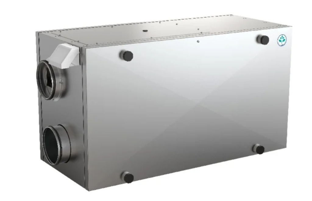 Bir ısı eşanjörü ile donatılmış besleme ve egzoz tipi havalandırma ünitesi, yuvarlak bir hava kanalı ile bağlanır. Plakalı ısı eşanjörü muhafazaya yerleştirilmiştir.