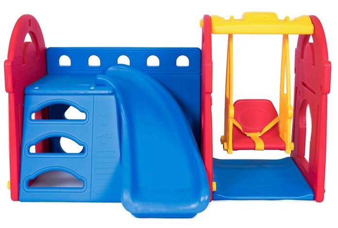 Bir ev, bir kaydırak ve bir salıncaktan oluşan minyatür bir oyun alanı, güçlü, güvenilir ve parlak plastikten yapılmıştır. Boyut - 101 x 170 cm, yükseklik - 100 cm 1,7 metrekaredir. m Keskin köşeleri ve çıkıntıları yoktur ve çok küçük çocuklar için bile mümkün olduğu kadar güvenlidir.
