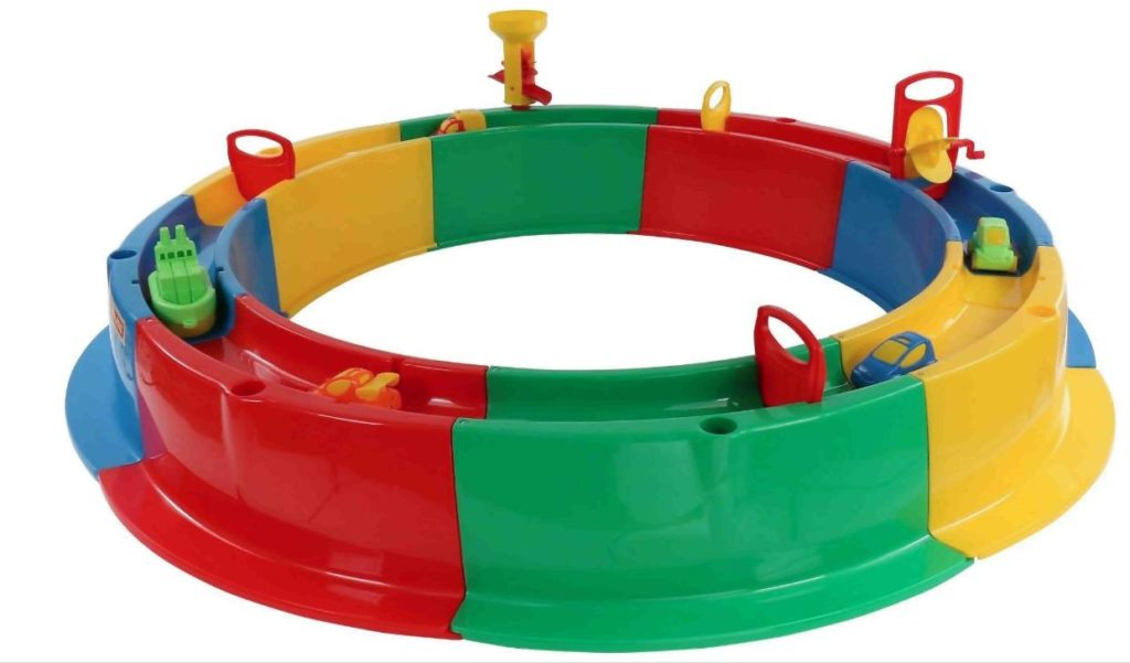 Katlanabilir taşınabilir parlak tasarım hem çocuklara hem de yetişkinlere hitap edecek. Kenar, içine su dökebileceğiniz ve böylece oyunları daha çeşitli hale getirebileceğiniz su değirmenleri ile doğaçlama bir nehir şeklinde yapılır. Orta kısımda sadece kumu değil, aynı zamanda kuru bir havuz için topları da doldurabilirsiniz. Boyut 136 x 136 cm, yan yükseklik - 22 cm.