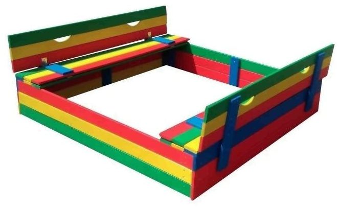 Kompakt ahşap sandbox, kolayca katlanabilen ve bir kapağa dönüşen banklarla donatılmıştır. Boyandığı parlak renkler çocukları kayıtsız bırakmayacak. Boyut - 150 x 150 cm, yan yükseklik - 40 cm.