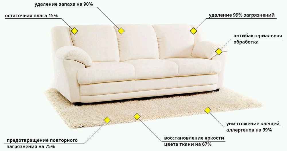 Mobilyaların temizliği etkili bir aspiratör yöntemi ile gerçekleştirilir. Şirketin duyarlı çalışanları işi kaliteli ve hızlı bir şekilde gerçekleştirir. Müşteri, fazla çaba harcamadan sonuca ulaşır. Eylemleri aşağıdakilerle sonuçlanır: