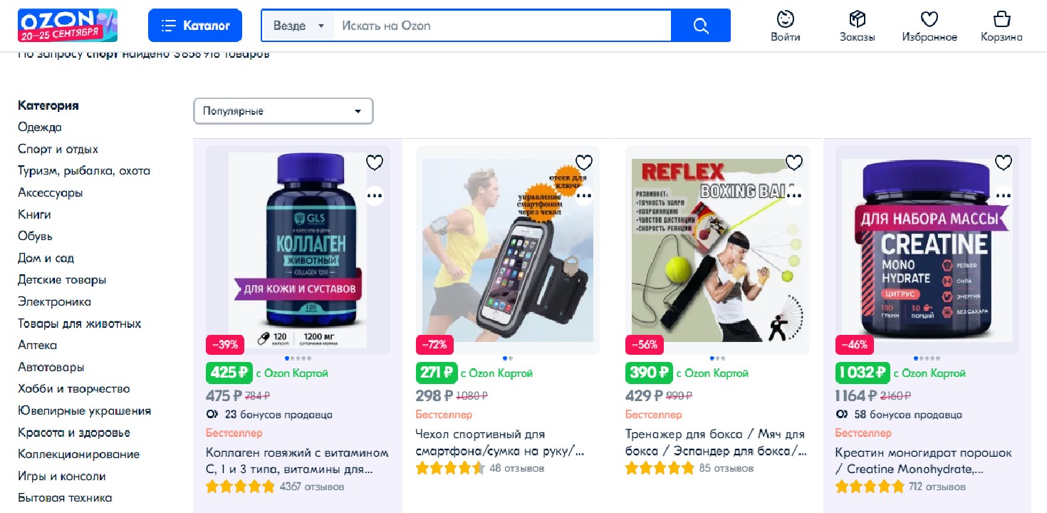 Beden eğitimi için çok çeşitli giysi, ayakkabı, spor ekipmanı, aksesuar ve alet. Ozone hesap sahiplerine özel bir sadakat programının yanı sıra sezonluk indirimler ve indirimler de var. Ayrı olarak, kurye ile hızlı teslimatı da belirtmekte fayda var. "Ozon taze" bölümünden sipariş verirken sadece birkaç saat içinde paketi teslim alabilirsiniz.