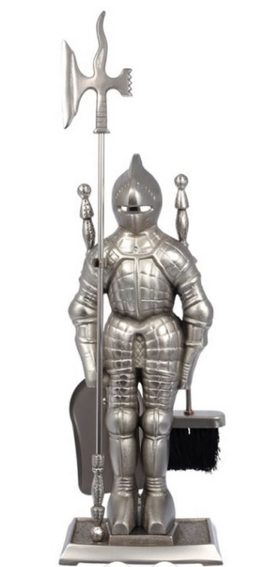 Çok güzel ve özgün tasarım seti. Hizmetçi, teberi de bir poker olan bir şövalye heykelciği şeklinde yapılır. Böyle bir poker ile kömürleri karıştırmak ve uzun için için yanan kütükleri bile kesmek için bir teber bıçağı ile uygundur. Çalışma kürek kepçesinin genişliği yeterlidir, çok miktarda kül toplayabilir. Ek olarak, standart olmayan bir şekle sahiptir - dar bir taban, genişletilmiş bir üst, çünkü toplanan külün kürekten yuvarlanması daha zordur. Tüm yapı, yüksek mukavemetli karbon çeliğinden yapılmıştır ve uzun ömür için nikel kaplıdır. Perakende zincirleri için önerilen maliyet 8200 ruble.
