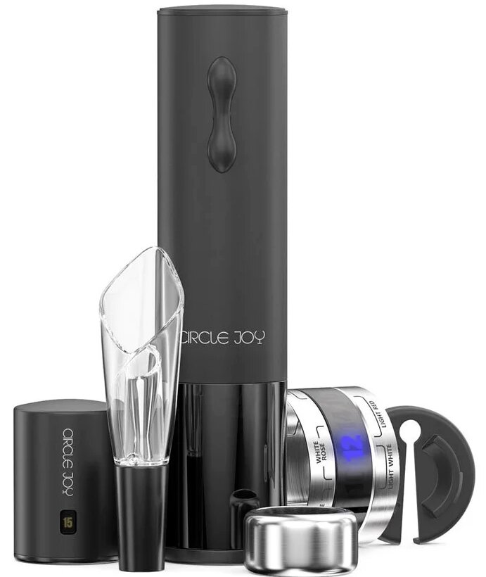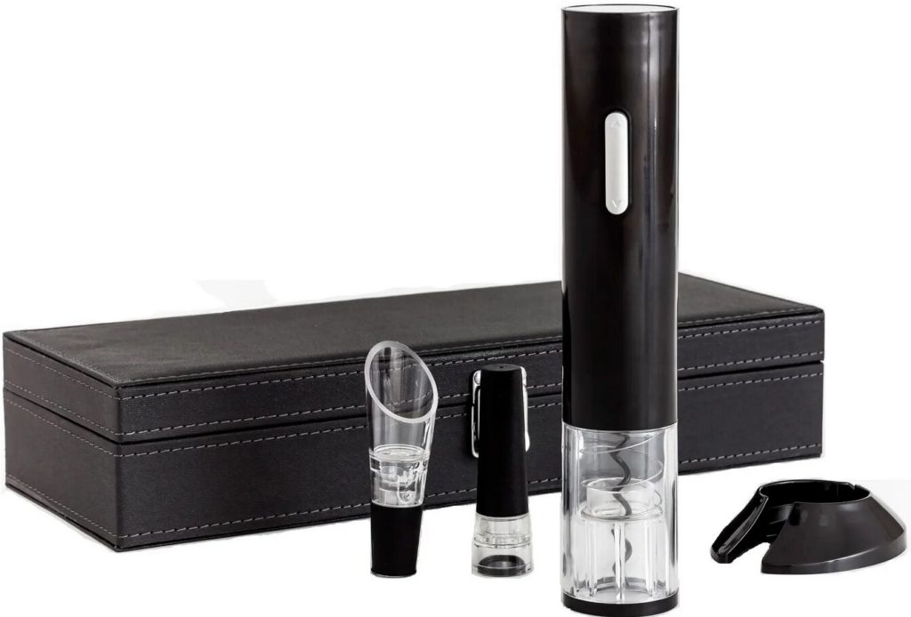 4 parça içerir: elektrikli tirbuşon, vakumlu tıpa, bıçak, havalandırıcı.