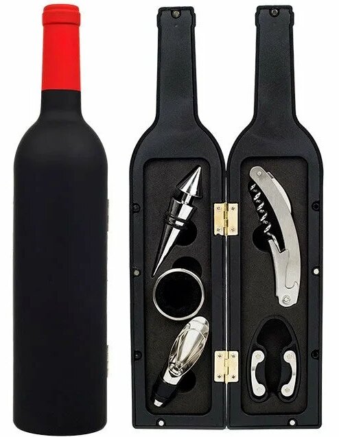 Kasa - siyah şarap şişesi, kırmızı boyun. İki özdeş parçaya açılır. İçeride - özel girintilerde bulunan 5 ürün.