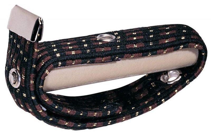 Boyuna elastik bant, kayış, Velcro ile sabitlenmiş bir çubuktan (metal, plastik) oluşur. İplerin preslenmesi, kayışın tutturucuları olan elastik bandın gerilimi ile düzenlenir. Bu tür klipsler bütçelidir (en düşük maliyetlidir), boynun arka tarafına zarar vermez, hafiftir, ilginç bir tasarıma sahiptir (çeşitli renkler) ve boyun şekline uyum sağlar (düz, kavisli).