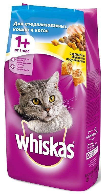 Whiskas, kısırlaştırılmış kediler için içi pate ile gevrek pedler şeklinde kuru bir mamadır. Yararlı maddeler ve besinlerin dengeli kombinasyonunda farklılık gösterir. Metabolizmayı iyileştirmeye ve bağışıklık sistemini harekete geçirmeye yardımcı olur. E vitamini, A, çinko, taurin ve Omega-6 ile zenginleştirilmiştir. Gerekli miktarda fosfor ve kalsiyumu birleştirir. Bileşenler ve lif kolayca sindirilebilir.Yiyeceklerin kuru dokusu plakların çıkarılmasına yardımcı olur. 450 ruble için iki kilogram yem satın alınabilir.