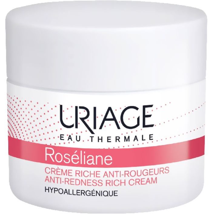 Fransız üreticiden Uriage-Roseliane, rosacea için etkili bir çözümdür, şirketin tüm ürünleri sıkı testlerden geçmektedir. İçindekiler arasında ginseng özleri, termal su, kırmızı algler, shea yağı ve ayrıca TLR2-Regul ve SK5R gibi kompleksler ayırt edilir.Böyle bir bileşim yüzdeki kızarıklık, kuruluk ve yanma ile baş eder. Kompozisyonun sabah ve akşam ve muhtemelen makyaj altına uygulanması tavsiye edilir. Kremin dokusu hoş bir aroma ile eriyor ve bileşime dahil edilen yeşil inci parçacıkları ortaya çıkan kızarıklığı hızla gizlemeye yardımcı oluyor. Alet, sıcaklık değişimlerine karşı mükemmel bir koruyucudur, ancak adil cinsiyet, yağlı cilde sahip olanlar için uygun olmayabileceğinin farkında olmalıdır, çünkü bileşimdeki yağlar sıcak havalarda parlamaya neden olacaktır.