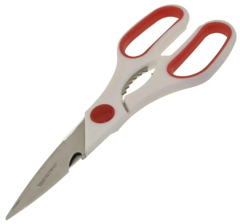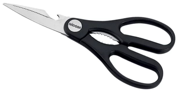 Kulplarda açıcı ve fındıkkıran bulunan klasik üniversal mutfak makası modeli. Cihaz dayanıklı malzemelerden yapılmıştır - paslanmaz çelik ve yüksek mukavemetli plastik. Sabitleme güvenilirdir, vida. Nadoba "Borga" sadece kümes hayvanlarını, balıkları kesmekle kalmaz, aynı zamanda şişeleri ve kavanozları açmaya (vidaları açmaya veya kapakları çıkarmaya), fındık kırmaya da yardımcı olur.Kesici kısmın boyu 20 cm dir, tırtıklı alan vardır. Ürün ağırlığı 275 g Aracın ortalama maliyeti 349 ruble.