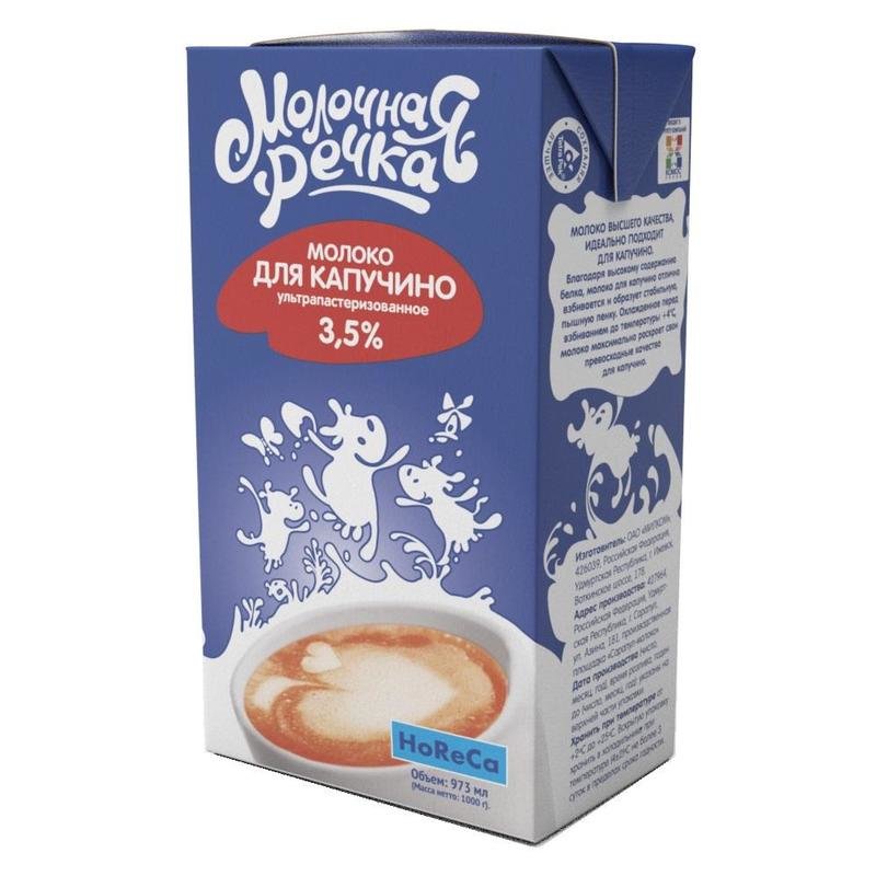 Cappuccino için süt nehri, %3,5 yağ içeriğine sahip ultra pastörize bir üründür. Yemyeşil, yoğun bir köpüğe kolayca çırpılan doğal sütten yapılır. Sadece bir içeceğin değil, diğer yemeklerin (hamur işleri, garnitürler vb.) hazırlanması için de uygundur. Ürün hoş bir tada ve mükemmel kaliteye sahiptir ve bebek ve yetişkin mamaları için uygundur. Üretimde, tüm faydalı eser elementleri koruyan ve ısıl işlem görmeden tüketilmesine izin veren modern teknolojiler kullanılmaktadır. Özel paketleme, açıldıktan sonra bile tazeliğini uzun süre korumayı mümkün kılacaktır. Süt çabuk kabarır ve hoş bir dondurma tadı vardır, köpüğü yoğundur ve uzun süre dayanır.