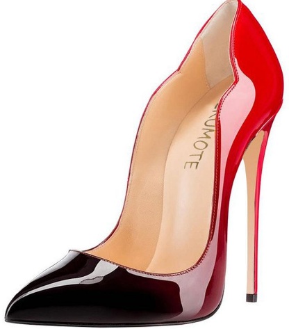 Sivri burundan topuğa yumuşak bir şekilde geçen tek renkli ışıklı lake ayakkabılar: bordo, açık bordo, kırmızı. Pim parlak kırmızıdır. Tabanı lastiklidir, kaymaz, kamadır. İç taban deri yerine yapılmıştır. Ürünün konturu yükselişte, her iki tarafta dalgalı (belirgin).