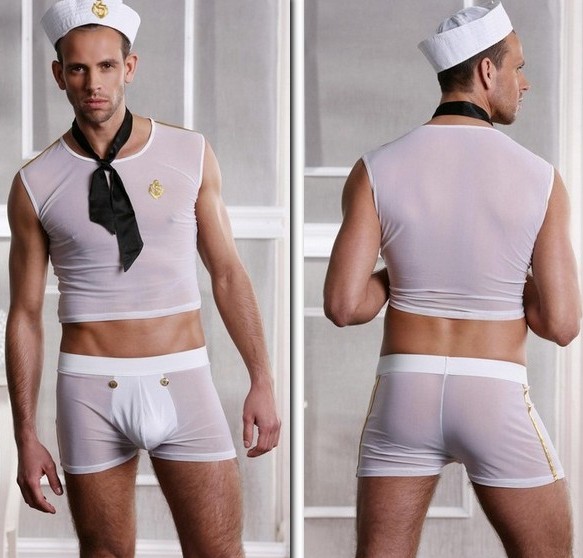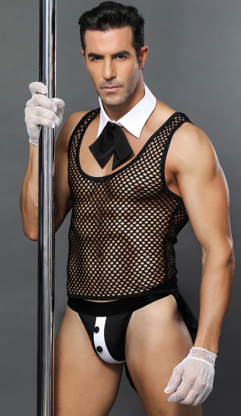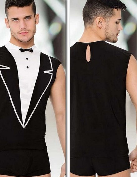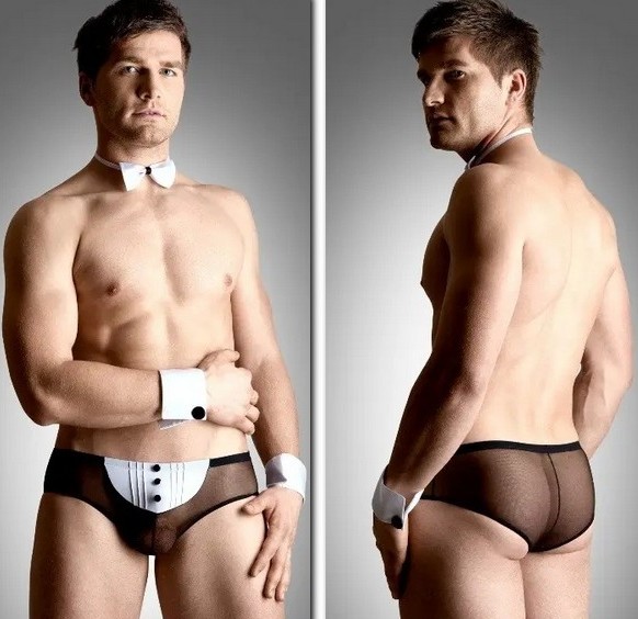 Önünde üç siyah düğmeli yarı oval beyaz bir yama bulunan, fallusu meraklı gözlerden gizleyen ve testisler ağdan görülebilen şeffaf şortların rol yapma oyunları için bir set. Böylece, ortaklar arasındaki entrika ve tüm fazla kıyafetleri hızla çıkarma arzusu korunur. Bileklere beyaz manşetler takılır, bir siyah düğme ile sabitlenir ve aksesuarın ortasında siyah bir kurdele ile aynı renkteki elastik bir bant üzerinde beyaz bir kelebek erkeğin boynunu süsler.
