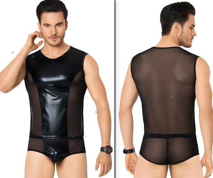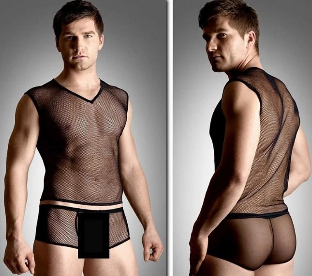 Bu set acımasız erkekler içindir: şort şeklinde külotlar, yuvarlak küçük yakalı bir tişört, kolsuz tek parça. Arkadan - önden şeffaf bir ağ - "Y" harfine benzeyen deri ekli bir ağ. Erkeklik bir deri elemanla kaplıdır.