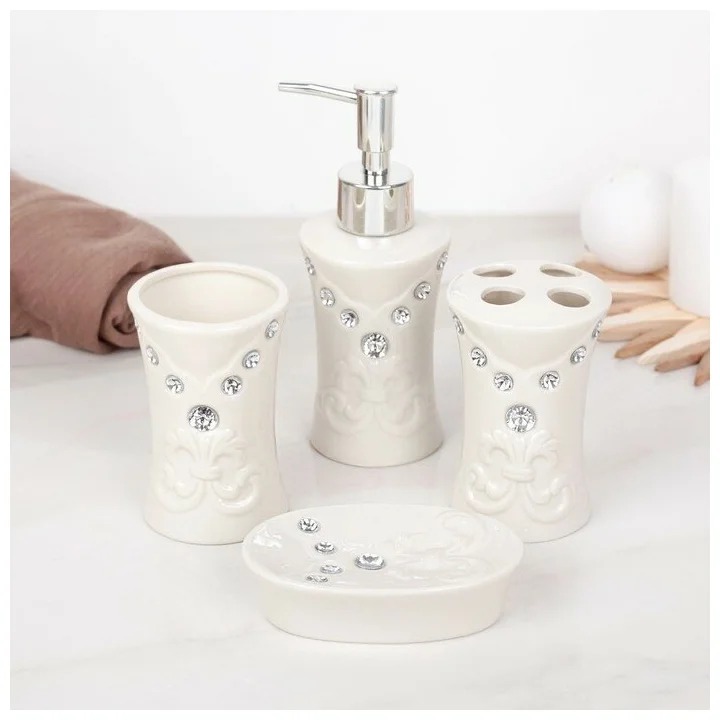 Banyo aksesuarları seti R-350104, sade ama özgün bir desene sahip en iyi seramiklerden yapılmıştır ve bu koleksiyonlar için standart ürünlerden oluşmaktadır. Bu tasarım, kitin herhangi bir tasarıma başarıyla uymasını sağlayacaktır.