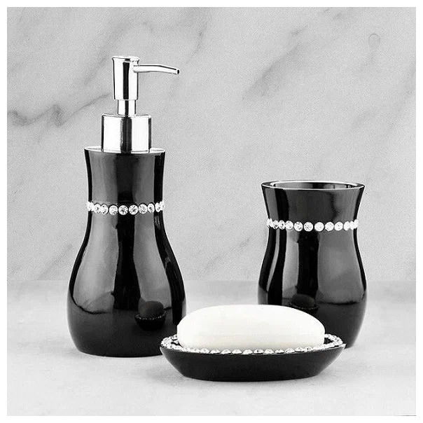 Yuvarlak şeffaf kristallerin hafif kenarlarına sahip bir dizi zarif siyah aksesuar, bir kutlama için harika bir hediye olacaktır. Her tarza bütünlük kazandıracak ve bileşimde bulunan polyresin ürünleri yüksek nem ve sıcaklık değişimlerinden koruyacaktır. Koleksiyon standart aksesuarlar içerir: